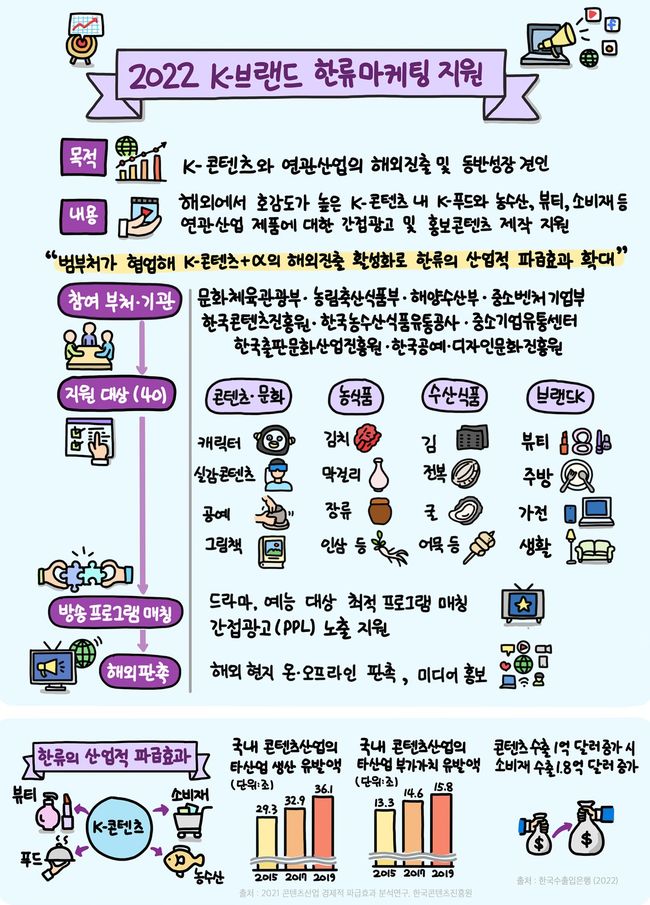 주관부처인 문체부가 드라마‧예능 등 한류 콘텐츠와 소비재 제품을 연결해 간접광고를 지원하면, 농식품부와 해수부, 중기부 등 협력부처가 해외 판촉과 온‧오프라인 홍보 등을 통해 광고효과가 실제 구매까지 이어질 수 있도록 돕는다.
