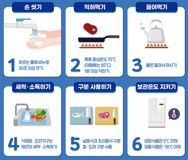 ▲ 식중독 예방 6대수칙.오유경 식약처장은 “이번과 같은 집중호우에는 식중독 발생에 각별한 주의가 필요하다”면서 “외출에서 돌아온 뒤나 식사 전, 화장실 이용 후 등에 반드시 비누를 이용해 손을 씻고 음식은 충분히 익혀서 섭취해야 한다”고 강조했다.