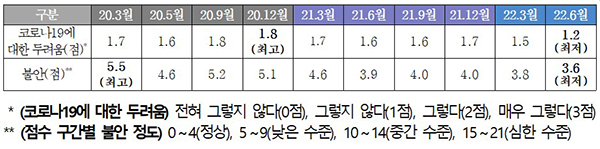 한편 코로나19 장기화로 시간이 지남에 따라 두려움 및 불안에 대한 수치는 감소 추세를 유지 중인데, 이번 조사결과는 코로나 기간 실시한 조사 중 가장 낮게 나타났다.