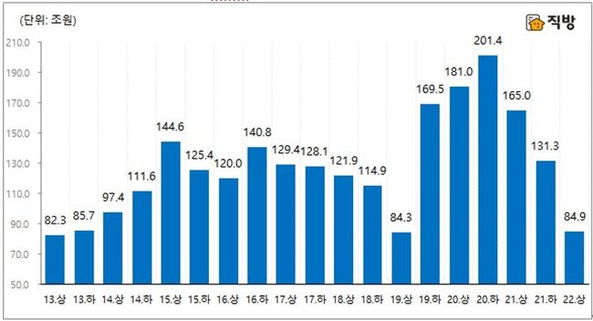 2022년 상반기 전국 주택매매거래 총액은 84.9조원으로, 2019년 상반기 84.3조원 이후 처음으로 100조원 이하로 줄어들었다. 역대 반기 최고거래액을 기록한 2020년 하반기 201.4조원에 비해 57.8%가 줄어들었고, 2021년 하반기 대비해서는 35.3%가 감소했다.