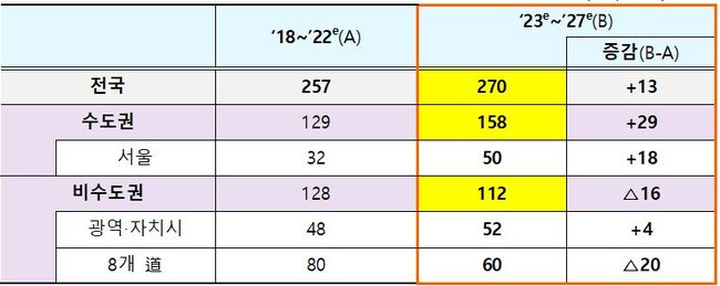 특히, 가장 수요가 많은 서울은 지난 5년간(‘18~’22) 공급된 주택(32만호)보다 50% 이상 증가한 50만호를 공급한다.