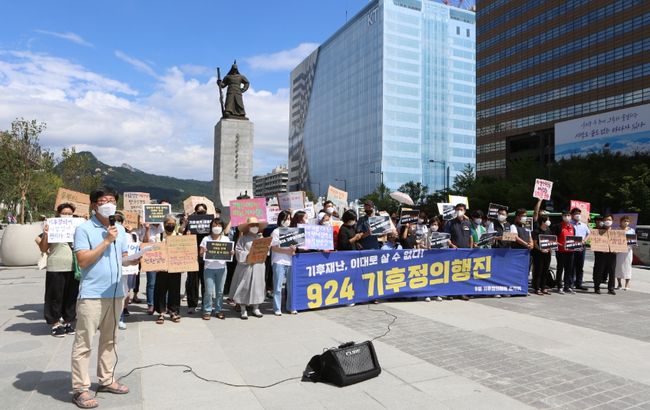 기후위기 비상행동은 24일 서울 광화문에서 `9.24 기후정의행진` 에 나서면서 `기후재난, 이대로 살 수 없다`고 외쳤다.9.24기후정의행진은 기후재난의 공포 앞에서 기후정의를 요구하고 직접 실현하려는 시민들, 노동자, 농어민, 여성, 장애인, 빈민, 종교인, 반전주의자, 성소수자, 청년, 청소년이 사회적 힘으로 결집해 기후위기 대안을 촉구하기 위한 행동이다.