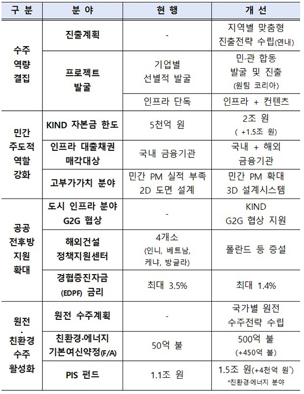 또 민간의 주도적인 역할을 강화하고 공공의 전후방 지원 기능 확대, 원전·친환경 수주 활성화 등 연 500억 달러 달성 전략도 추진한다.