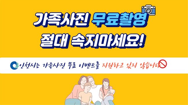 인천광역시가 인천시민을 대상으로 하는 `무료 가족사진 촬영`과 `제주무료 여행`등 허위 과장 광고로 인한 시민들의 피해가 잇따르자 이에 대한 주의를 당부했다.