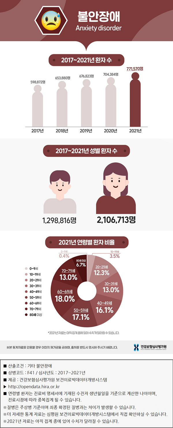 최근 5년간 불안 장애 환자 수는 지속적으로 증가하는 모습을 보이고 있습니다. 성별에 따른 환자 수는 여성 환자 수가 남성 대비 약 62% 많았으며, 연령별 환자 비율은 20대부터 79세까지의 연령에서 고르게 나타났습니다.
