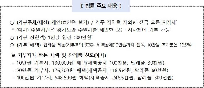 고향사랑기부제는 개인이 자신의 주소지가 아닌 고향 등 다른 지자체에 기부하면, 해당 지방자치단체는 기부금을 모아 그 지역의 주민복리 증진 등을 위해 사용하는 제도로서, 내년 1월 1일 시행을 앞두고 있다.