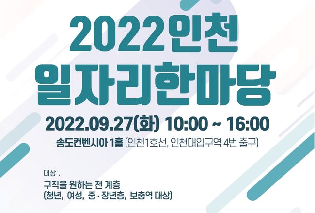 `2022 인천 일자리한마당`채용행사가 오는 9월 27일(화) 송도컨벤시아 1홀에서 개최된다.