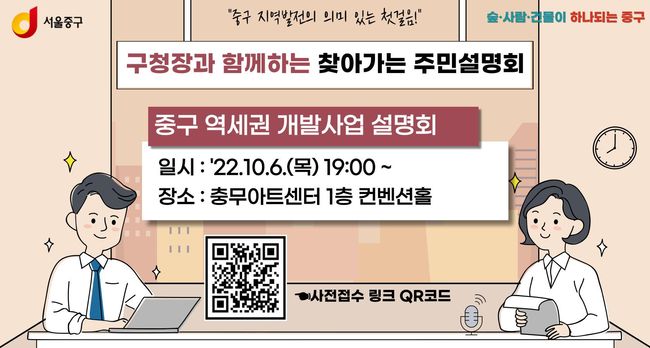 10.6. 설명회에 참석을 희망하는 주민은 중구청 홈페이지의 공지사항의 ‘구청장과 함께하는 찾아가는 주민설명회’배너 또는 QR코드를 통해 신청하면 된다. 사전접수 기간은 9.26. 부터 10.4. 까지다. 설명회 참석자에게는 서울시 역세권 개발사업 설명교재도 배부된다.