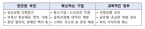 실손보험 간편청구, 부동산 청약과 거래 등과 같은 정부 서비스를 구축하는 프로젝트를 추진하고 관행에서 벗어나 AI/데이터에 기반한 국정관리 체계를 확립한다.