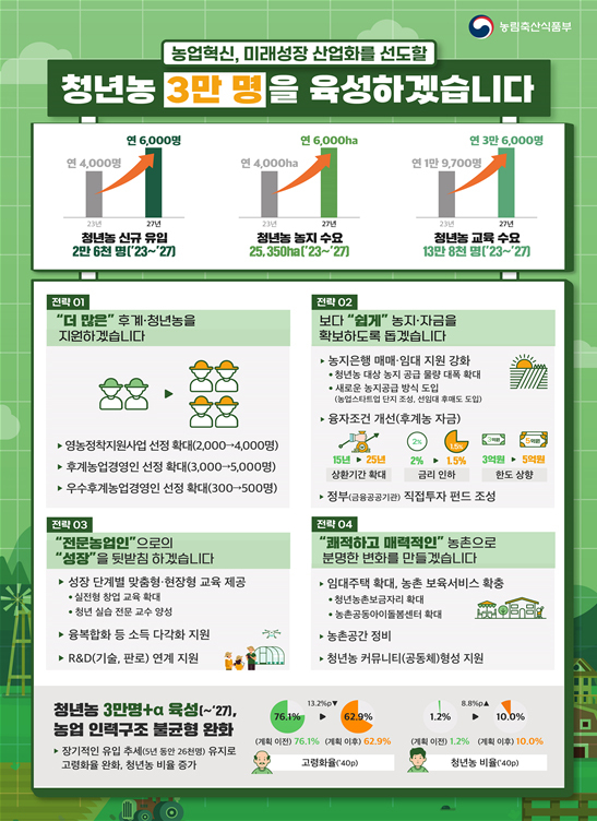 농림축산식품부는 5일 제9차 비상경제민생회의에서 이 같은 내용을 포함한 ‘제1차(2023~2027년) 후계·청년농 육성 기본계획’을 발표했다.