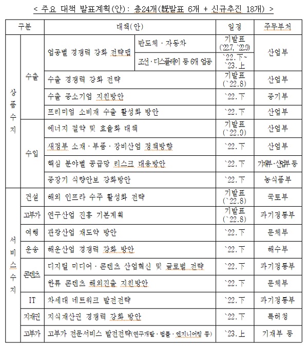 정부는 경상수지 개선을 위해 내년 초까지 총 18건의 신규 대책을 발표하겠다고 밝혔다. 조선, 디스플레이, 이차전지, 바이오 등 주요 수출업종(6개) 경쟁력 강화 전략과 수출 중소기업에 특화된 별도 지원대책을 순차적으로 마련해 시행하기로 했다.