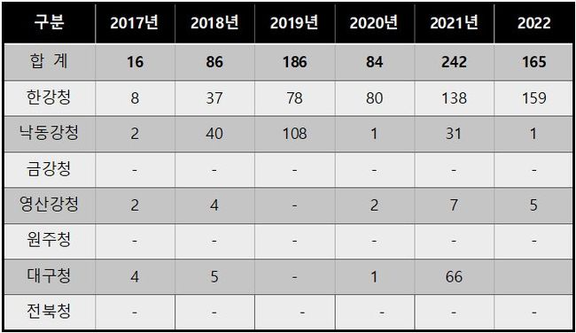 사정이 이런데도, 전국의 유역환경청과 지방환경청이 수집·운반업자를 적발·조치한 실적은 2017년 영산강유역환경청의 단 2건 이후 전무하다. 특히, 한강유역환경청 소관 수집·운반업자의 보관기준 초과 건수는 2017년 8건에서 올해 6월 기준 159건으로 늘어 20배 가까이 늘어났지만, 같은 기간 적발 건수는 0건이었다.