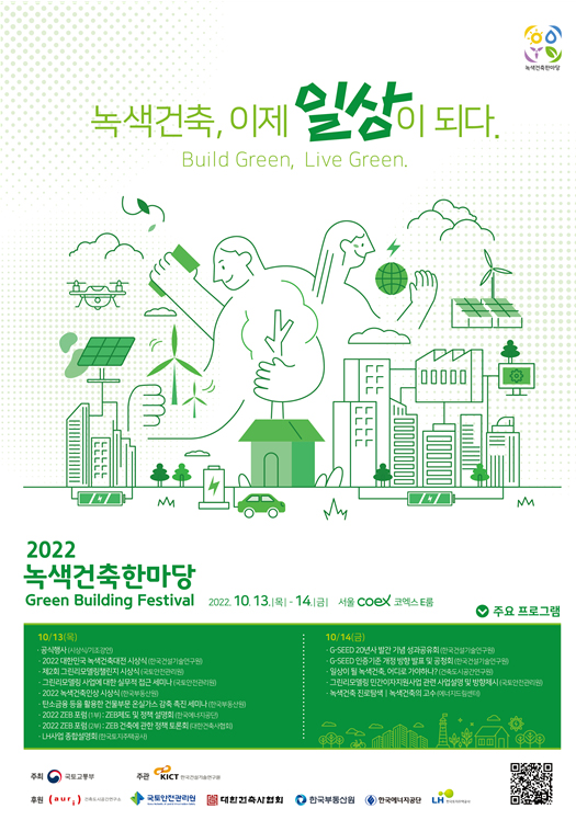 [일간환경연합 김경훈 기자]국토교통부가 주최하고 한국건설기술연구원이 주관하는 ‘제12회 2022 녹색건축한마당’이 13~14일 서울 코엑스에서 열린다.