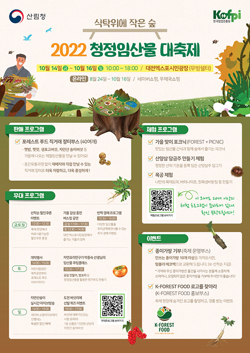 산림청은 한국임업진흥원과 함께 14일부터 16일까지 대전시 엑스포 시민공원에서 ‘식탁 위에 작은 숲’을 주제로 한 ‘2022 청정임산물 대축제’ 오프라인 행사를 개최한다고 13일 밝혔다.