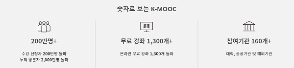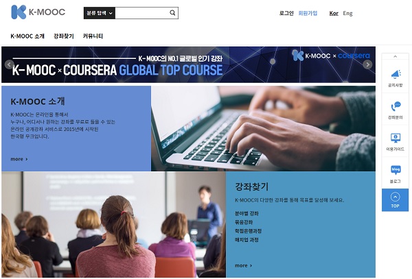 [일간환경연합 한선미 기자]세계 최고 수준의 지식과 경험을 공유할 수 있는 ‘케이무크(K-MOOC)’는 대학·기관의 우수한 온라인 강좌를 누구나 언제 어디서든 무료로 수강할 수 있는 한국형 온라인 공개강좌다.