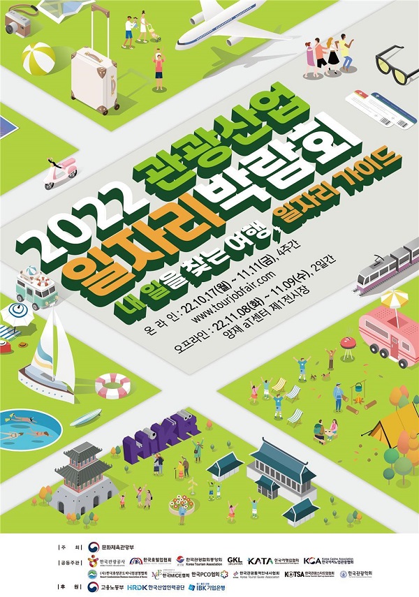 [일간환경연합 김경훈 기자]문화체육관광부는 한국관광공사, 한국호텔업협회, 한국관광협회중앙회 등 12개 관계기관과 함께 다음 달 11일까지 ‘2022 관광산업 일자리 박람회’를 공식 누리집(www.tourjobfair.com)과 서울 에이티(aT)센터(11월 8~9일)에서 온·오프라인으로 개최한다고 17일 밝혔다.
