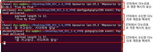 ▲ 다누리 메시지 송수신 결과.우주인터넷탑재체는 지상인터넷과 달리 데이터를 분할해 전송하고 데이터는 NASA, 항우연의 통신중계장치(노드)를 거쳐 ETRI로 전달한다.