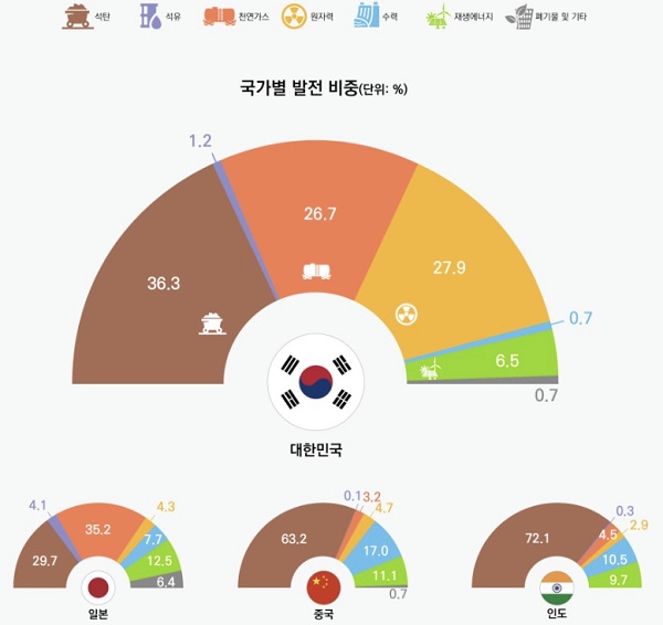 ▲ 2020년 기준 국가별 발전비중. (사진=한국에너지정보문화재단)2020년 기준 우리나라의 에너지믹스는 석탄 36.3%, 원자력 27.9%, 천연가스 26.7%, 재생에너지 6.5%, 석유 1.2%, 수력 0.7%, 폐기물 및 기타 0.7%다.
