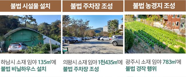 D씨는 하남시 소재 임야 663㎡를 교회 주차장으로 조성, E씨는 하남시 소재 임야 135㎡에 직원휴게실 용도로 비닐하우스를 설치, F씨는 시흥시 소재 임야 264㎡에 창고를 설치해 산지관리법 위반으로 적발됐다.