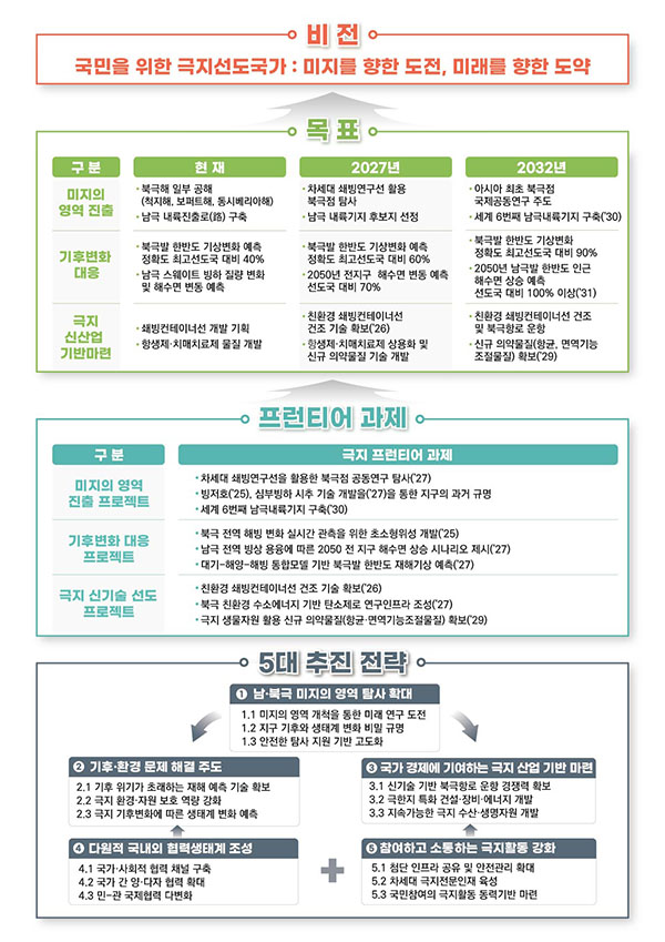 이번 기본계획은 남북극을 포괄하는 동시에 과학연구뿐만 아니라 경제활동과 국제협력, 인력양성까지 극지활동 전반을 아우르는 최초의 법정 기본계획이다.