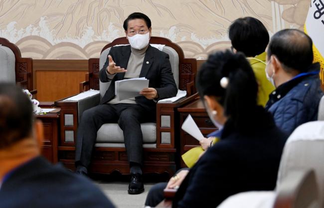 유정복 인천광역시장이 30일 시청 접견실에서 열린 `제3차 집단민원과 소통의 날`에서 옛 롯데백화점 부지 개발을 통한 상업지구 활성화 민원과 관련해 대화를 하고 있다.