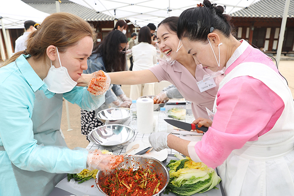 ▲ 9월 28일 충남 아산 외암민속마을에서 열린 ‘2022 외국인 대상 한식 원데이 투어’에서 외국인 참가자들이 포기 김치를 체험하고 있다.(사진=문화체육관광부 국민소통실)연간 대미 김치 수출액은 2018년 900만 달러에서 2019년 1480만 달러, 2020년 2300만 달러, 지난해 2820만 달러로 꾸준히 증가했다.