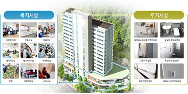 고령자복지주택은 고령자 주거안정을 위해 무장애설계가 적용된 임대주택과 사회복지시설을 함께 조성*하는 사업으로, ’27년까지 총 5천호 공급을 목표로 적극 추진하고 있다.
