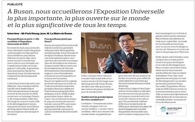 이는 박형준 부산시장이 지난 11월 28일부터 12월 7일까지 제171차 국제박람회기구(BIE) 총회 참석을 계기로 나선 유럽 주요국 순방에서, 2030부산세계박람회 유치 홍보 활동의 일환이자 부산의 도시브랜드 제고를 위해 프랑스, 불가리아 등 현지 언론과의 인터뷰에 적극 나선 성과다.