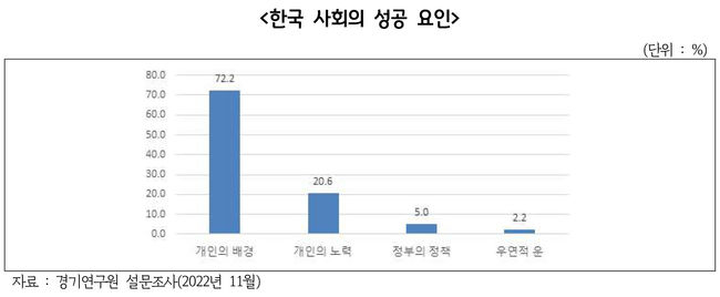 연구원은 지난 11월 8일부터 11일까지 수도권 성인 1천31명을 대상으로 한국 사회에서 대학 진학, 취업, 소득이나 부 등 사회경제적 성취가 어떤 요인에 의해서 가장 많이 영향을 받는다고 생각하느냐 질문했고, 수도권 성인의 72.2%(744명)가 개인의 배경을 형성하는 환경(부모의 학력이나 소득 등)이라고 응답했다. 반면 개인의 노력은 20.6%(212명)에 불과했고, 정부의 노력은 5.0%(52명), 우연한 운은 2.2%(23명)로 나타났다.