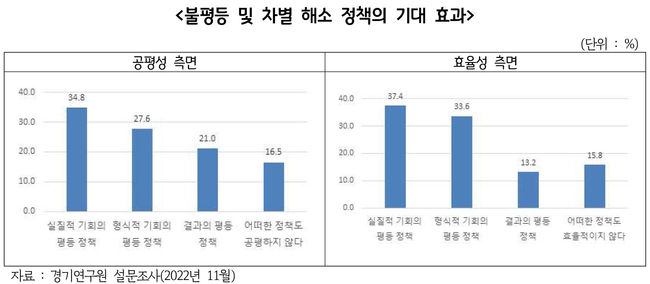 불평등이나 차별을 해소하는 정책 중에서 어느 것이 가장 공평하다고 생각하냐는 질문에는 교육과 금융 등 불평등의 원인을 해소하는 ‘실질적 기회 평등’ 정책이 34.8%, 혈연·학연·지연·성별 등에 의한 차별을 방지하는 ‘형식적 기회 평등’ 정책 27.6%, 소득과 부를 재분배하는 ‘결과의 평등’ 정책 21.0% 순이었다.