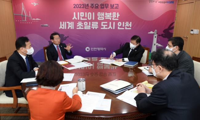 유정복 인천광역시장이 29일 시청 접견실에서 해양항공국 2023년도 주요업무계획을 보고받고 있다.