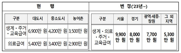 기본재산공제액 기준 변경은 윤석열 정부의 국정과제 중 하나인 국민맞춤형 기초보장 강화 추진의 일환으로, 그동안 주거재산의 가격 상승 등을 반영해 현실에 맞게 지역 구분 및 공제액 기준을 보완하기 위한 취지다.