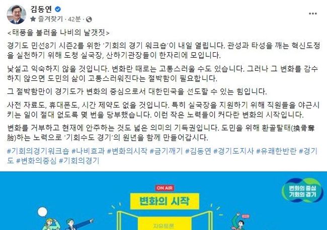 김동연 지사는 5일 자신의 SNS에서 ‘태풍을 불러올 나비의 날갯짓’이라는 제목의 글을 통해 “경기도 민선 8기 시즌2를 위한 ‘기회의 경기 워크숍’이 내일(6일) 열린다. 관성과 타성을 깨는 혁신 도정을 실천하기 위해 도청 실국장, 산하기관장들이 한자리에 모인다”라며 “사전 자료도, 휴대폰도, 시간 제약도 없을 것이다. 특히 실국장을 지원하기 위해 직원들을 야근시키는 일이 절대 없도록 몇 번을 당부했다. 이런 작은 노력들이 커다란 변화의 시작”이라고 강조했다.