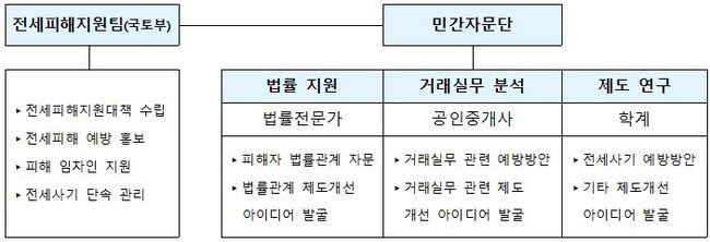 민간자문단은 전문분야를 고려하여 법률반, 실무거래반, 제도연구반으로 구성하였으며, 전세계약 관련 법률·거래실무 등에 대한 피해자 질의와 국토부의 제도 개선사항 등에 대한 전문적 자문을 지원한다.