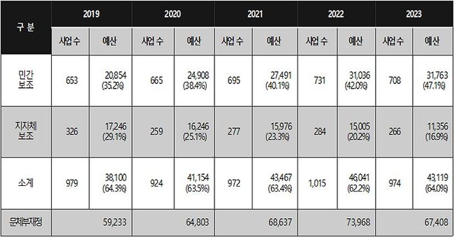 문체부 소관 보조사업 예산은 ’19년부터 ’22년까지 연평균 6.5% 증가했으며 문체부 전체예산 대비 보조사업 비중은 꾸준히 60% 이상을 차지하고 있다. 내년에는 국가균형발전특별회계 지방 이양과 코로나 한시 지출 정상화 등에 따라 보조사업 예산은 감소했지만, 문체부 전체예산에서 차지하는 비중은 여전히 64%에 이르고, 그중 민간 보조사업은 47.1%이다.
