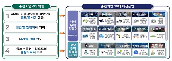 먼저 중견기업 15대 핵심 산업을 중심으로 글로벌 진출, 공급망 안정, 디지털 전환에 2033년까지 1조5000억 원 규모의 기술개발 자금을 투입해 각 분야별로 100~150개 선도 기업군을 집중적으로 지원할 예정이다.