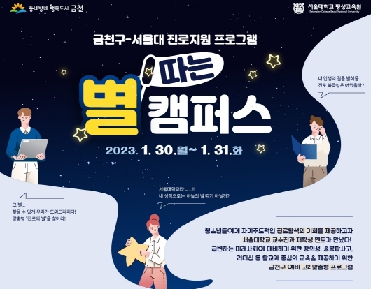 [일간환경연합 한선미 기자] 금천구는 1월 30일부터 31일까지 서울대학교 캠퍼스 본원에서 고등학생 50명을 대상으로 캠프형 멘토링 프로그램 ‘별 따는 캠퍼스’를 실시한다고 밝혔다.