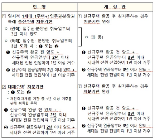 또 1세대 1주택자가 재건축·재개발 기간 동안 거주할 목적으로 대체주택을 취득한 경우에도 신규주택 완공일로부터 3년 내에 처분하면 비과세 혜택을 받을 수 있도록 처분기한을 1년 연장한다.