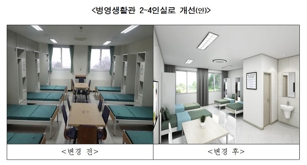 병영생활관도 개선된다. 미래세대 장병들의 요구와 선호를 충족할 수 있도록 병영생활관의 생활실을 위생시설이 포함된 2~4인실로 개선한다. 생활실 거주인원을 현행 9인 기준에서 2인 내지 4인으로 줄이고, 화장실과 샤워실을 생활실 내에 배치한다.