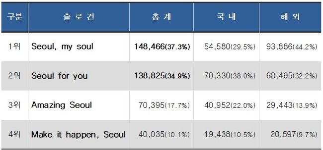 그 결과 전체 1위는 Seoul, my soul, 2위는 Seoul for you이고, 내국인은 Seoul for you, 외국인은 Seoul, my soul을 각각 1위로 선택했다.