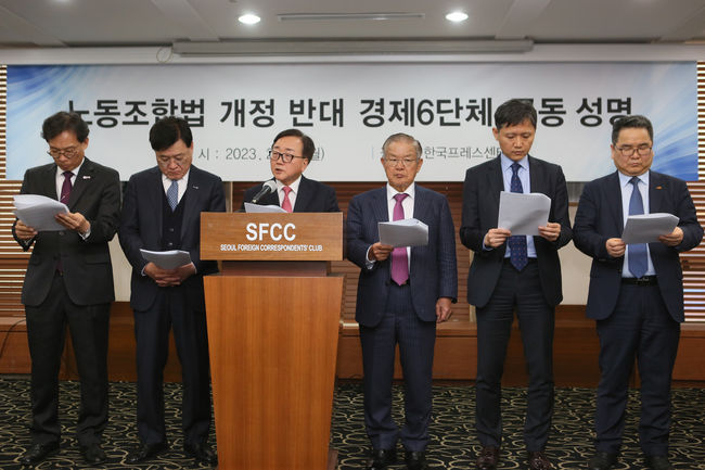 경제6단체는 13일 오후 한국프레스센터 18층 외신기자클럽에서 열린 `노동조합법 개정 반대 경제6단체 공동 성명`에서 "노동계와 일부 정치권이 노동조합법 본연의 목적은 무시한 채 근로 3권 보호에만 치중한 나머지, 법치주의를 훼손하고 헌법상 가치와 민법 기본원리에 반하는 주장을 거듭하고 있다"며 강력 반발했다.