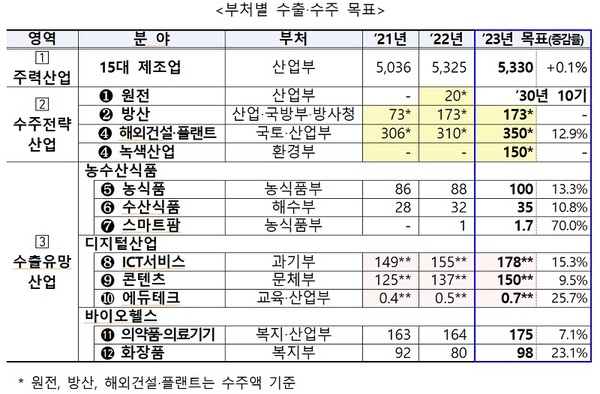 산업부는 15대 제조업을 통해 올해 5330억 달러, 2030년까지 10기의 원전 수출 목표를 세웠다. 방산은 산업부·국방부·방사청을 중심으로 173억달러를 수출한다는 계획이다.