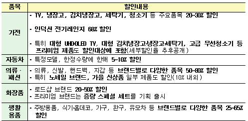 | 주요 품목군별 할인내용 |