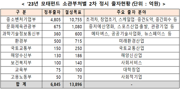 이번 출자에는 중기부 외에 교육부, 과학기술정보통신부, 문화체육관광부, 보건복지부, 환경부, 고용노동부, 국토교통부, 해양수산부가 참여한다.