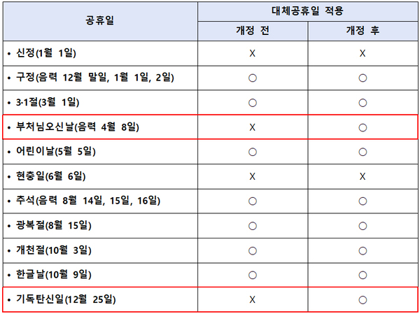 [일간환경연합 한선미 기자]올해부터 부처님오신날(음력 4월 8일)과 기독탄신일(12월 25일)에도 대체공휴일이 적용될 전망이다.