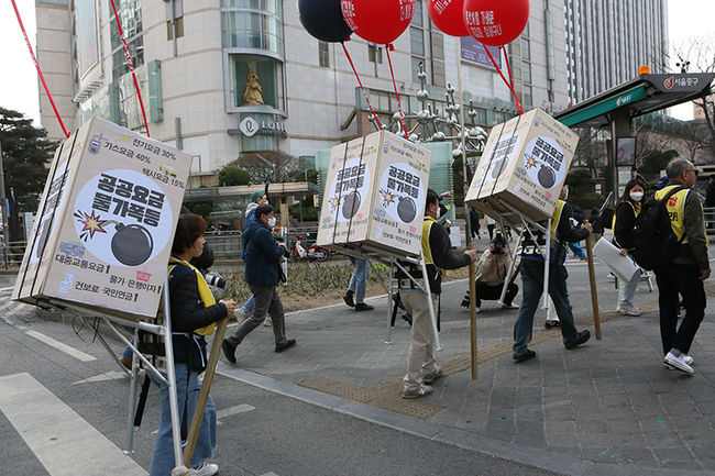 20일 오후 한국전력 서울본부에서 개최된 `공공요금 인상철회! 사회보험 강화! 서울시민-공공노동자 행진`에서 공공운수노조는 "2023년 도시가스 요금은 작년에 비해 36.2%, 지역난방비는 34%, 전기요금은 29.5%가 올랐다"며 운을 뗐다.