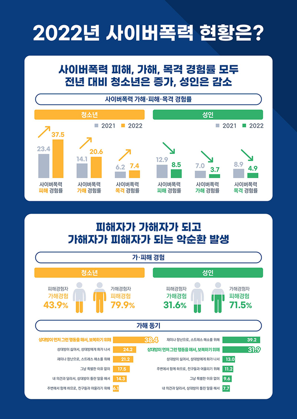 이번 조사결과에 따르면, 한국 청소년의 사이버폭력 경험률(가해+피해+가·피해)은 41.6%로 전년대비 12.4%p 증가한 것으로 나타났다. 반면, 성인의 사이버폭력 경험률은 9.6%로 전년 대비 6.2% 감소한 것으로 집계됐다.
