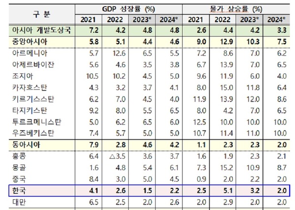 ▲ ADB 지역별 경제성장률 및 물가상승률 전망