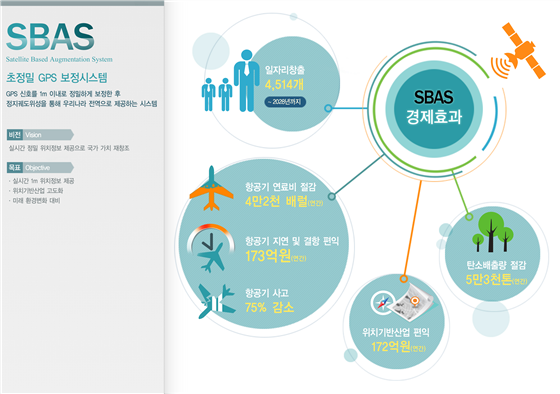 보정시스템(SBAS)은 GPS 오차를 보정해 항공 외 선박, 교통, 물류, 응급구조 등 다양한 분야에 활용 가능한 인공위성 기반 오차보정시스템이다.