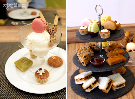 | 미래먹거리산업으로 각광받고 있는 식용곤충으로 만든 아이스크림, 마카롱, 당근머핀, 그린티 피낭시에(왼쪽)와 에프터눈 티. 보기에도 예쁘고 맛도 일반 디저트처럼 맛있다. |